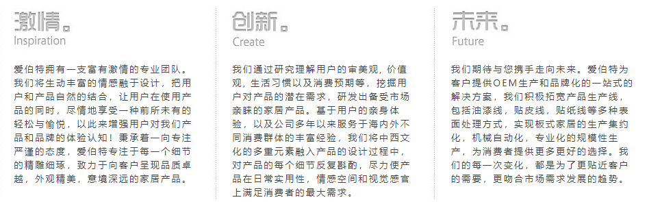 愛伯特家居有限公司屬中外合資企業,成立于2007年,坐落于福建漳州北斗工業園區,占地66000平方米。對于板式家具,木質家居產品,我們專業的團隊有著世界頂級的生產能力,產品原料及品質要求符合國際各類管理體系的標準。愛伯特自創始之日起至今,始終保持超乎尋常的成長速度。我們與(HomeDepot,Lowes,Aldi,Lidl